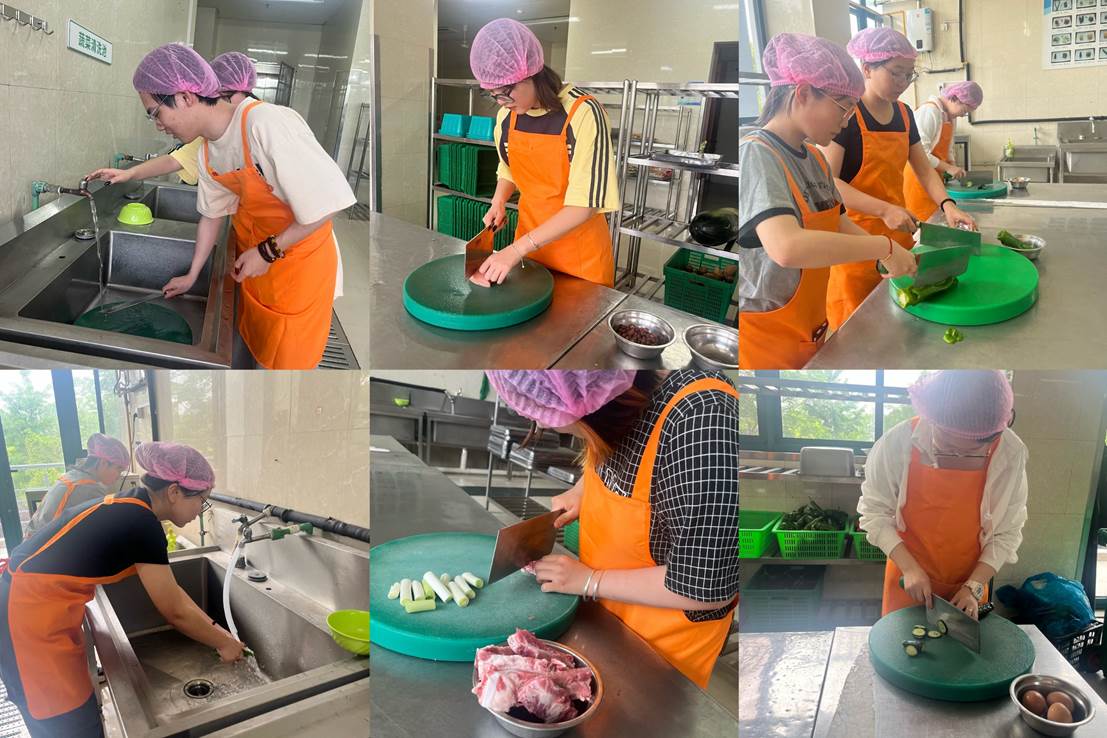 中午时分,洗切间热闹非凡,参与活动的同学们干劲十足,开始清洗自己的材料;清洗完后,同学们开始切配食材,想要烹煮的菜应该怎么切食材,这也是一种讲究,不少同学开始回忆妈妈是怎么加工的,有些同学现场连线请教妈妈指导。