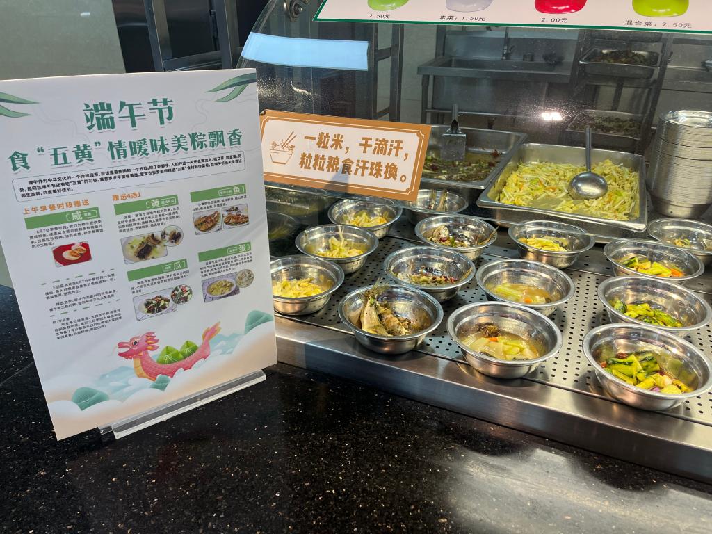 早餐和中餐时段,中心准备了咸鸭蛋、香炸小黄鱼、黄鳝炖长瓜、炝黄瓜及韭菜炒蛋——“五黄”菜肴皆为当令食品,免费提供给前来就餐的师生,希望大家身体安康、健康长寿。