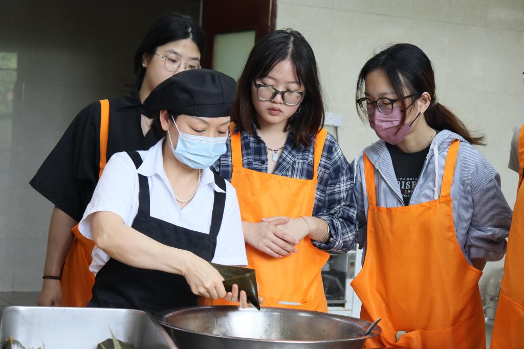 中午时分,“厨艺创新课堂”实践教室热闹非凡,在中心师傅们的带领下,参加课程的同学们体验“包粽子”:捋粽叶、做漏斗、填米肉……每个步骤看似简单,上手却不易,同学们纷纷表示,小小粽子,满载技术。在大家的共同努力下,共包制百余只粽子。