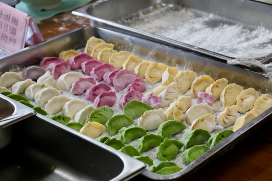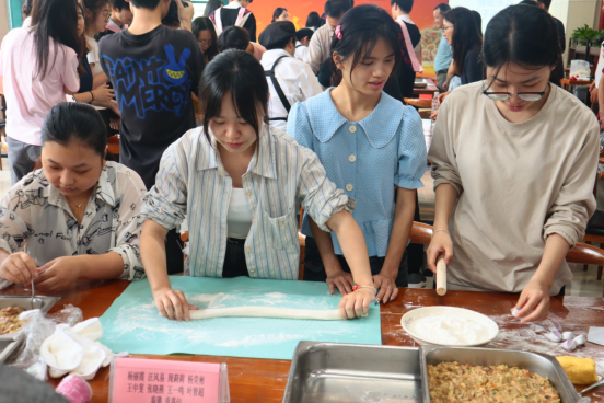 “对,擀面皮的时候要注意用手掌根。”“还有一种白菜边挤法……”“看,我的元宝饺子,真漂亮!”你擀面皮,我包馅料,在大家的默契配合,这批“真情面粉”很快变成了特殊的毕业礼物“五彩饺”。