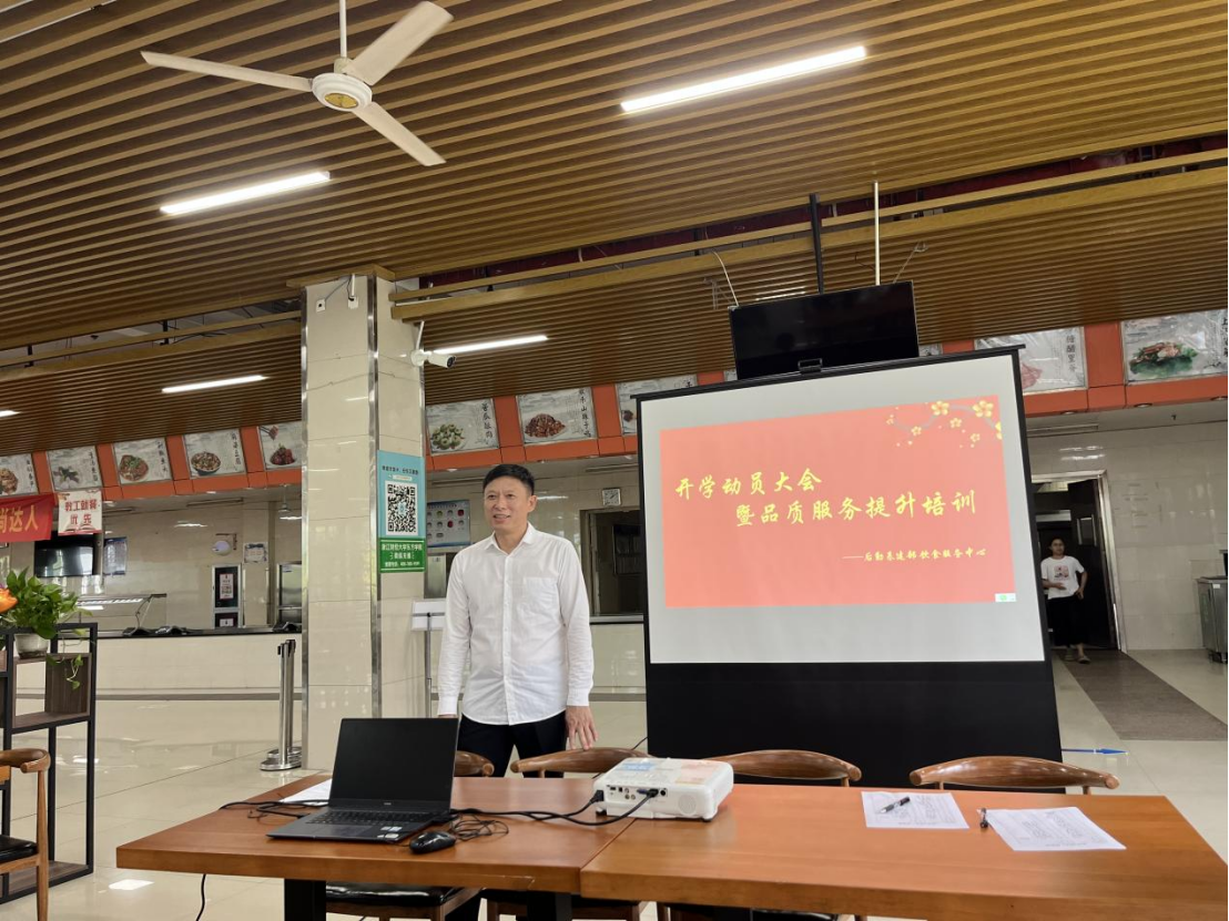 8月30日,中心召集所有员工开展开学动员大会,希望在新学期,餐饮服务人员能提升餐饮业务能力的同时,有更饱满的精、气、神,为师生提供更优质的服务。
