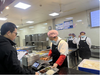 12日中午时段,一餐厅窗口围满了参观的学生,这是中心在开展窗口服务员考核。“你好,请问需要吃什么?”,一句简单的问候,窗口服务员每天需要问无数遍,这是他们的工作需要,恰恰也能体现出他们的关怀和温暖,这也是考核的项目之一,当然,打菜的分量、菜价核算也是必考的项目。围观的学生纷纷感慨,原来食堂还有这么“专业”的考核机制。