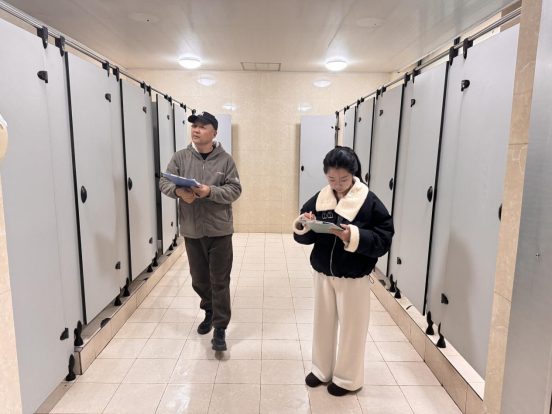 保洁班组以保洁员各自责任区域卫生间为单位,开展为期一个月的卫生间卫生情况考核,通过对卫生间的墙面、横杆、便池、镜子等卫生情况进行检查评分。