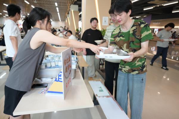 活动期间,师生在餐厅用餐并实现“光盘”后,可凭餐盘至指定兑奖处免费兑换酸奶一杯。9月14日午餐时间起,兑奖处便陆续迎来一批批完成“光盘”挑战的师生,大家有序参与,现场气氛热烈。一名大一新生在领取酸奶后表示:“这个活动很有意义!通过即时奖励,让我们真切体会到节约行为被认可和鼓励,自己也更有动力践行‘光盘’。”