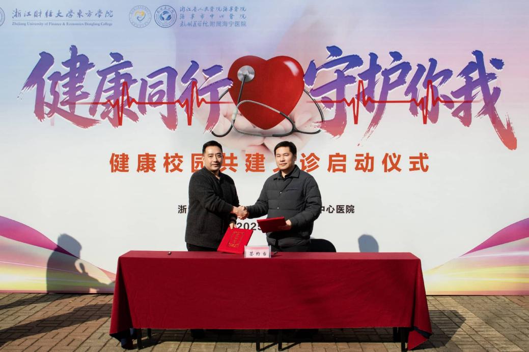 在全体与会人员的共同见证下,学院与海宁市中心医院代表现场签署“健康进校园”合作协议,标志着校医协同的健康服务机制正式建立。签约仪式后,与会嘉宾合影留念,并一同前往义诊服务区参观指导。