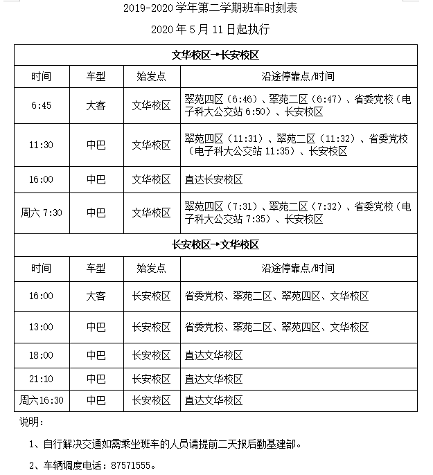 2019-2020学年第二学期班车时刻表(2020年5月11日起执行)