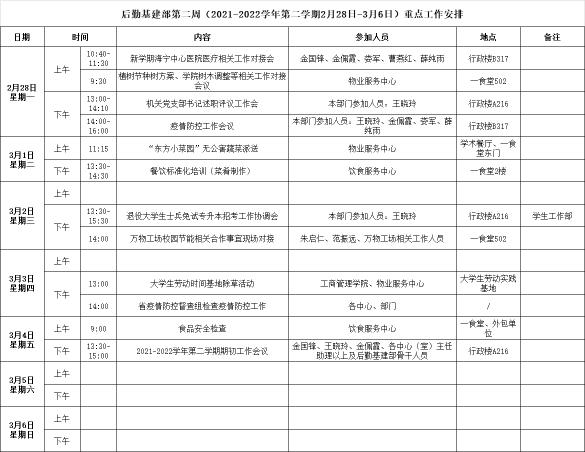 后勤基建部第二周(2021-2022学年第二学期2月28日-3月6日)重点工作安排