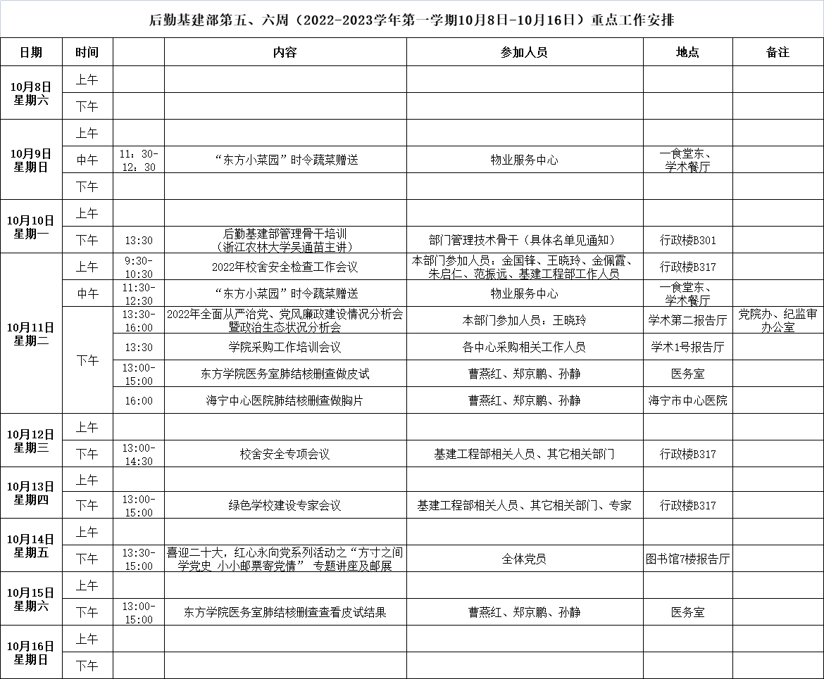 后勤基建部第五、六周(2022-2023学年第一学期10月8日-10月16日)重点工作安排.xls