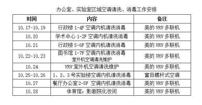 为持续做好学院疫情防控工作,净化学院办公室、实验室及图书馆环境,后勤基建部计划从10月17日(周一)至10月28日(周五)对全院集中式空调进行清洗、消毒。