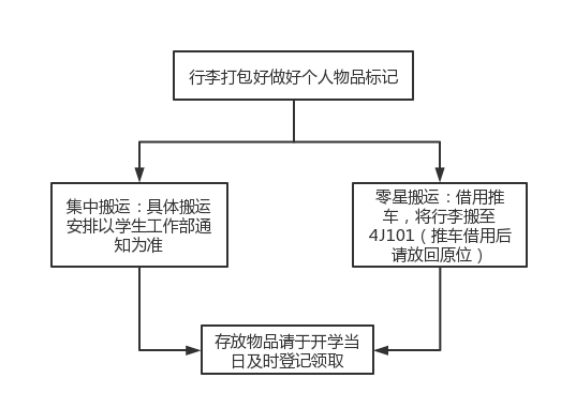 5、涉及相关宿舍楼的同学,请将个人物品打包封存放于个人床铺位置。零星搬运的同学如有需要请将个人非贵重物品转存暑期临时存放点4J-101,并于4J值班室处登记个人信息,粘贴好行李标签(可在6月19日后在4教值班人员处领取一个打包袋并存入)。