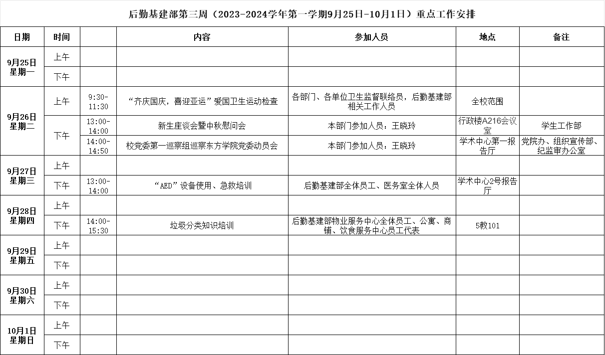 后勤基建部第三周(2023-2024学年第一学期9月25日-10月1日)重点工作安排