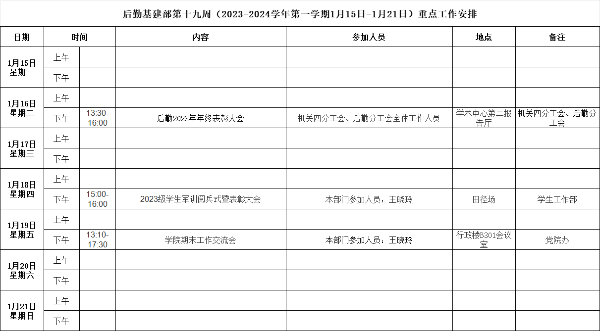 后勤基建部第十九周(2023-2024学年第一学期1月15日-1月21日)重点工作安排.xls