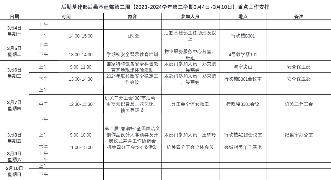 下一篇:后勤基建部后勤基建部第一周(2023-2024学年第二学期2月26日-3月3日)重点工作安排重点工作安排