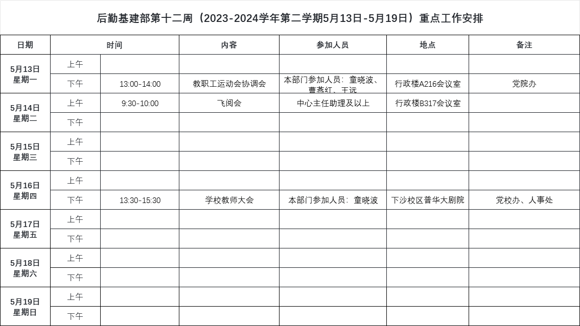 后勤基建部第十二周(2023-2024学年第二学期5月13日-5月19日)重点工作安排.xlsx