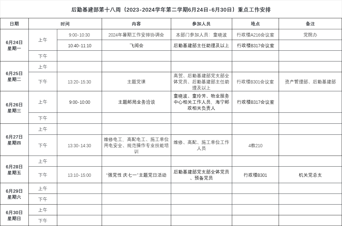 后勤基建部第十八周(2023-2024学年第二学期6月24日-6月30日)重点工作安排