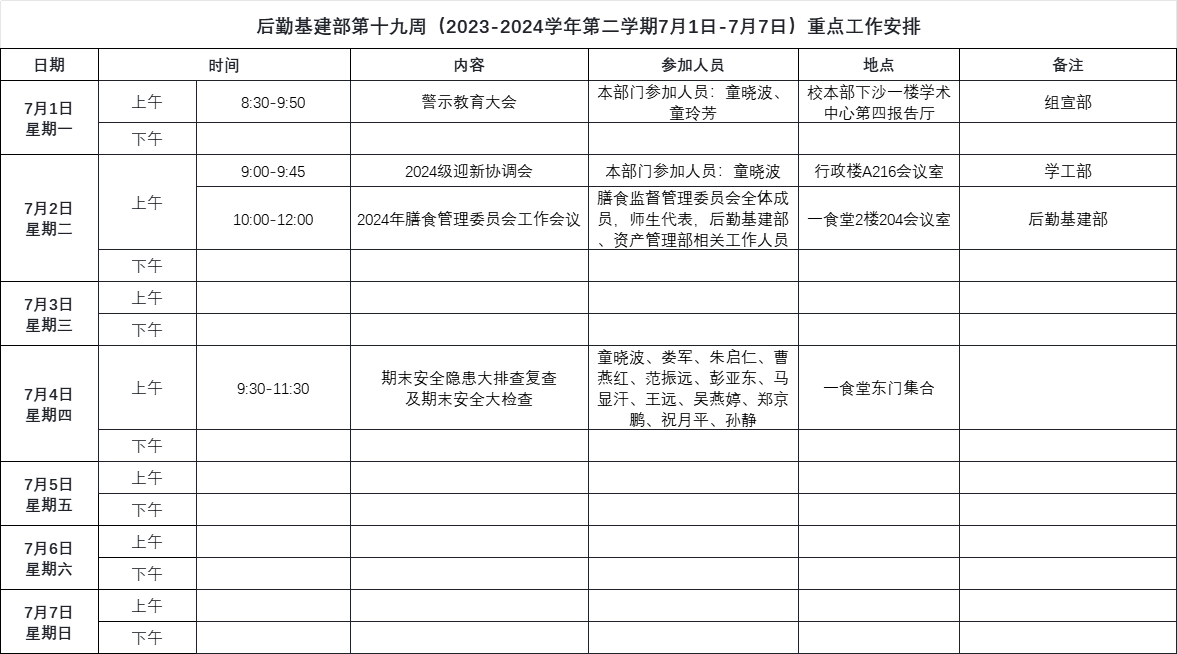 后勤基建部第十九周(2023-2024学年第二学期7月1日-7月7日)重点工作安排.xlsx