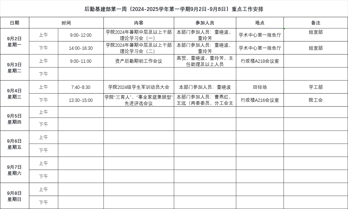 上一篇:后勤基建部第一周(2024-2025学年第一学期9月9日-9月15日)重点工作安排