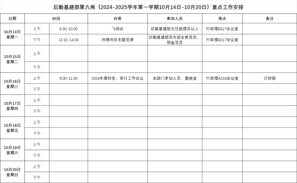 后勤基建部第六周(2024-2025学年第一学期10月14日-10月20日)重点工作安排