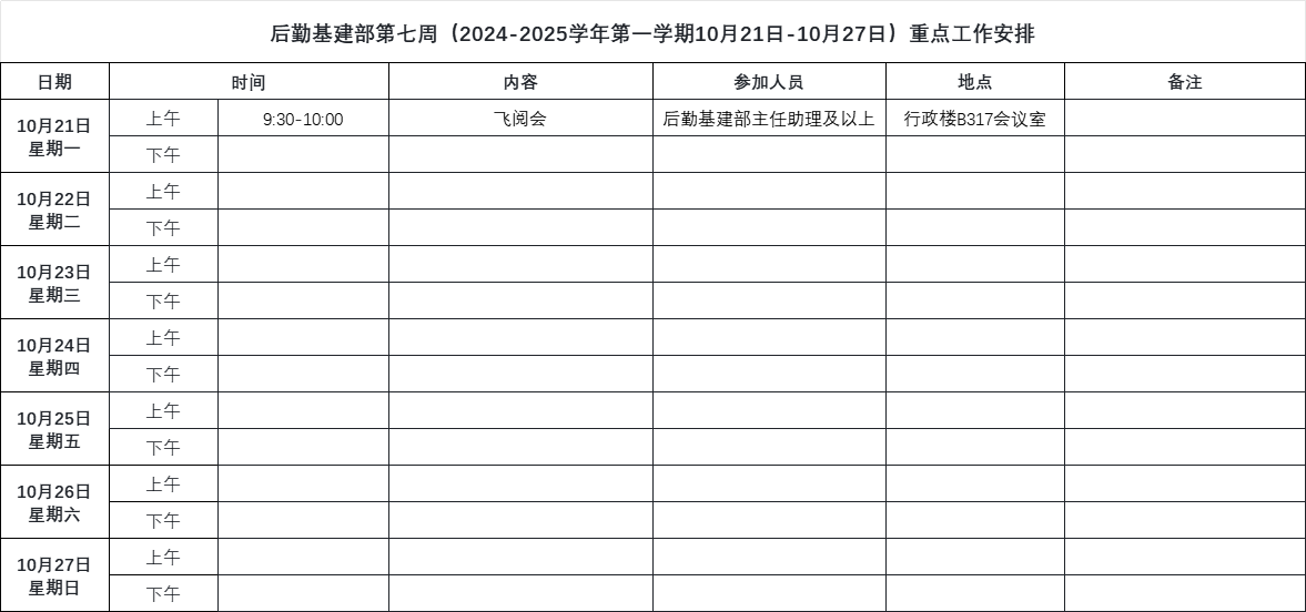 后勤基建部第七周(2024-2025学年第一学期10月21日-10月27日)重点工作安排