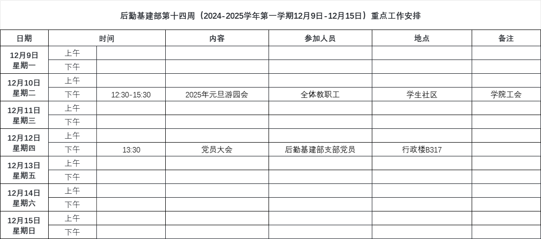 后勤基建部第十四周(2024-2025学年第一学期12月9日-12月15日)重点工作安排.xlsx