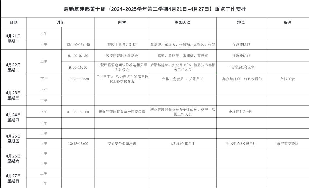 后勤基建部第十周(2024-2025学年第二学期4月21日-4月27日)重点工作安排