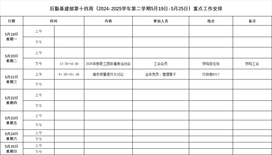 上一篇:后勤基建部第十五周(2024-2025学年第二学期5月26日-6月1日)重点工作安排