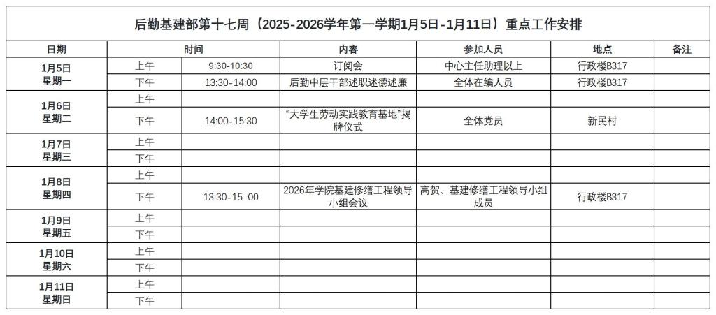 上一篇:后勤基建部第十八周(2025-2026学年第一学期1月12日-1月18日)重点工作安排