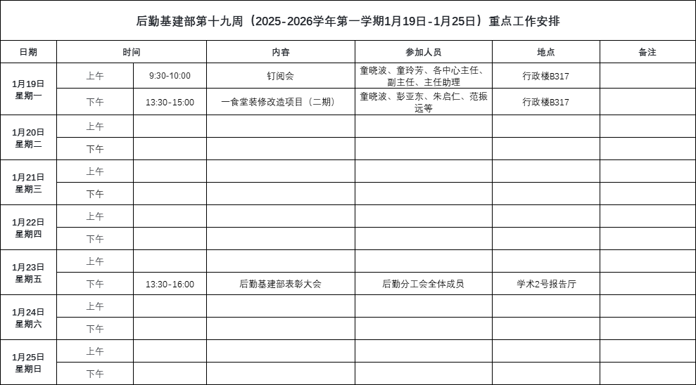 下一篇:后勤基建部第十八周(2025-2026学年第一学期1月12日-1月18日)重点工作安排