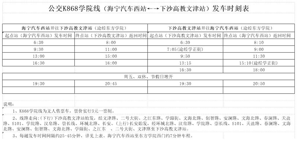 转海宁市大元公交有限责任公司,自2026年3月1日起恢复K868学院线(海宁汽车西站←→下沙高教文津站)发车时刻,同时恢复城铁站往返东方学院接驳车。现将868学院线和接驳车发车时间表公布:
