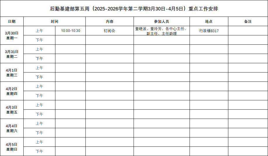 后勤基建部第五周(2025-2026学年第二学期3月30日-4月5日)重点工作安排.xlsx
