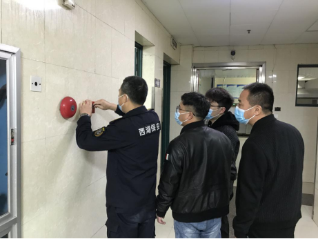 在检测手动火灾报警系统时,检查组成员向现场各餐厅负责人详细介绍了火灾手动报警按钮的作用和正确操作的方法,并按下火灾报警开关进行火灾报警演练。