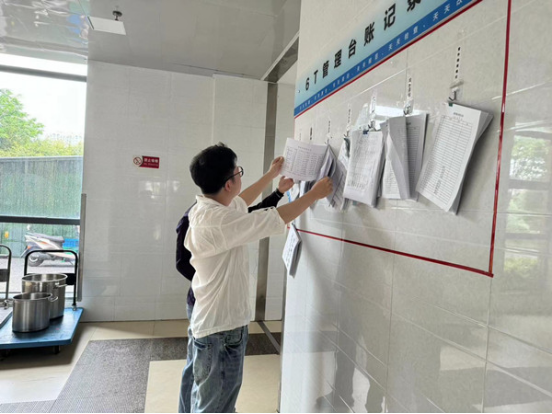 检查小组围绕从业人员健康管理、餐用具清洗消毒、食品原材料贮存放置、食品留样、日台账登记等内容进行全面检查,防范和化解食品安全风险。特别是在食堂规范管理方面,重点排查包括:一是有无遵循先进先出的原则使用各类食品原料,保证保鲜度;二是有无落实进货查验制度,严格把控食材关;三是操作加工过程是否规范,杜绝异物混入;四是食堂环境卫生是否做到全面打扫,餐饮具有无进行规范清洗消毒;五是食品安全岗位责任有无落实到位,进行日管控、周排查等。总体上,各餐厅明亮整洁,规范管理到位。检查中发现美食城后厨个别地沟盖板尺寸不对,存在安全风险点,已现场要求责任单位抓紧落实整改。