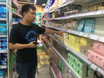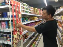 校内超市货架摆放太满,手拿物品容易卡住手指,不符合货架摆放二指原则