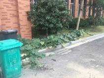 学术餐厅垃圾点垃圾堆放杂乱多。且绿化带私种南瓜