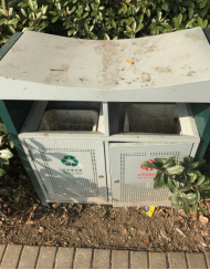 16号寝室楼下垃圾桶身脏。