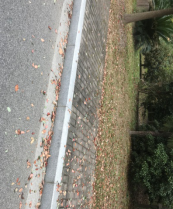 体育馆西北面主干道、人行道落叶未扫。