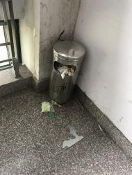 1教1-2楼楼梯平台垃圾桶内垃圾溢出,未及时倾倒。