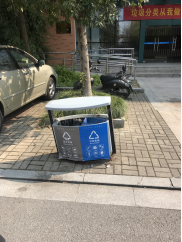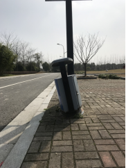 2号实验楼西门垃圾桶底座松动,倾斜严重。