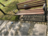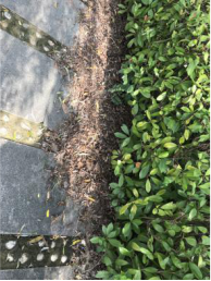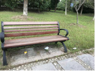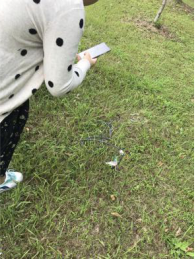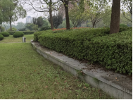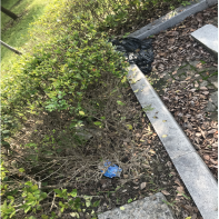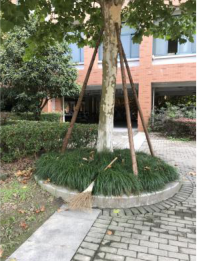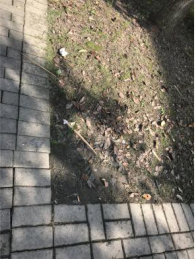 4号教学楼西面绿化带内清扫工具未收回放好,草坪垃圾未清理。