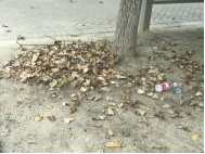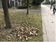 发现问题:操场西面人行道上落叶较多,绿化带成堆的落叶未及时清理。责任保洁员在洗车点串岗聊天,且未穿工作服。