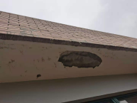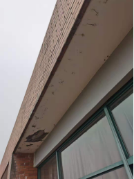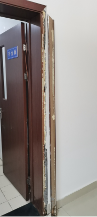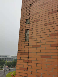 2号教学楼5楼露天阳台墙面防水保护层破损、缺失,室内墙壁受潮反碱,墙面大面积起皮。