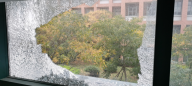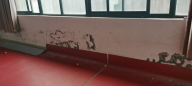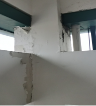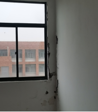 7号教学楼中间楼梯5楼楼梯间墙皮受潮起皮。