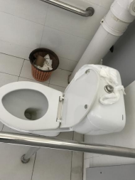 7J-1楼女厕所垃圾桶倾倒不及时。坐便器上有丢弃的纸巾未及时清理。