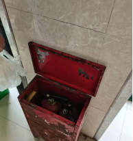 一食堂厨房灭火箱腐烂、灭火箱内有杂物且无日期牌。