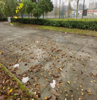 东门北侧绿化带、且停亭白色垃圾较多;篮球场边上落叶和白色垃圾较多。