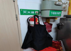 美食城精品牛肉拉面档口灭火器上放置厨房用具衣物