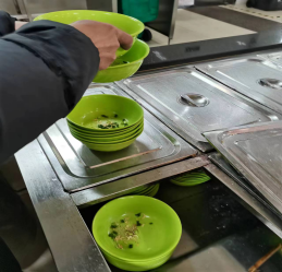 一食堂一餐厅面点窗口餐具提前放好佐料后套叠堆放