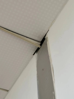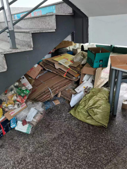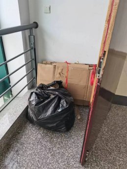 1号教学楼东楼梯下三角空间及三楼门背后堆放纸板、杂物;五楼走廊吊顶个别龙骨松落。