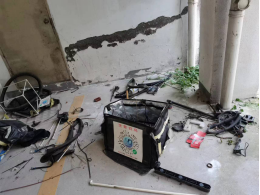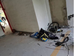 12号寝室楼架空层卫生环境差,杂物随意堆放。