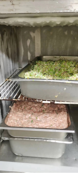 一食堂部分冷柜里的馅料、食材存放未加盖或覆膜。